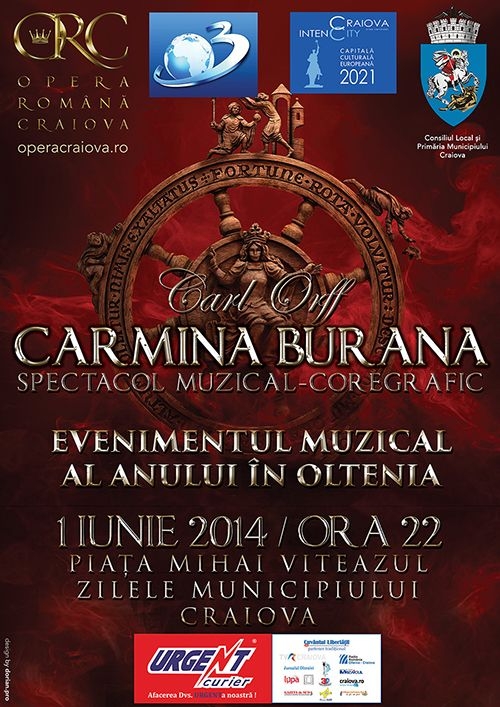 Opera Română Craiova, brand local și național în peisajul cultural, este onorată să prezinte duminică, 1 iunie 2014, începând cu orele 22:00, în piaţa Mihai Viteazul, Evenimentul muzical al anului – cantata profană Carmina Burana de Carl Orff.